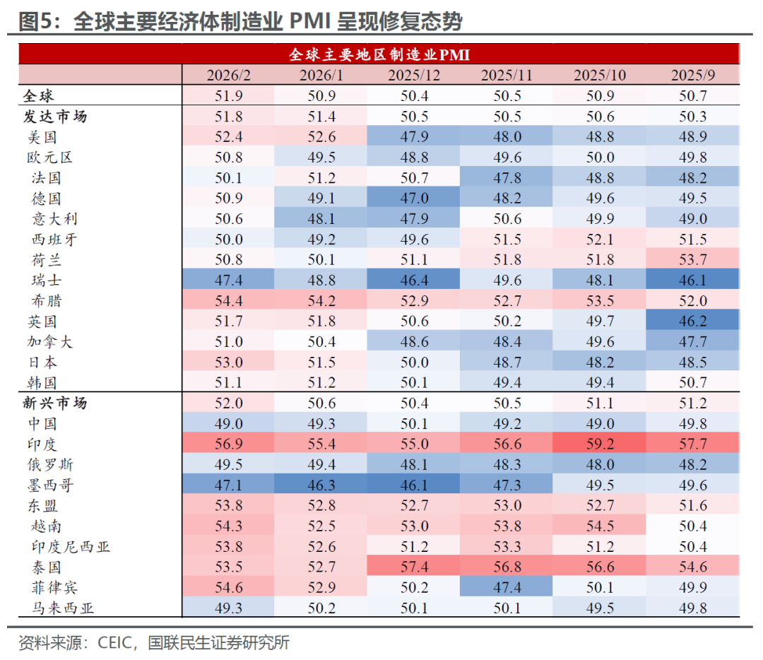 其一,出口的强势表现与海外资本开支周期形成强映射。年初以来全球主要经济体制造业景气度普遍改善,全球制造业PMI一度跃升至51.9%。主要经济体如美国、欧元区等均重回荣枯线以上,外部需求回暖趋势清晰,对我国出口形成明显拉动,这一点从年初韩国出口的亮眼表现也能得到印证。