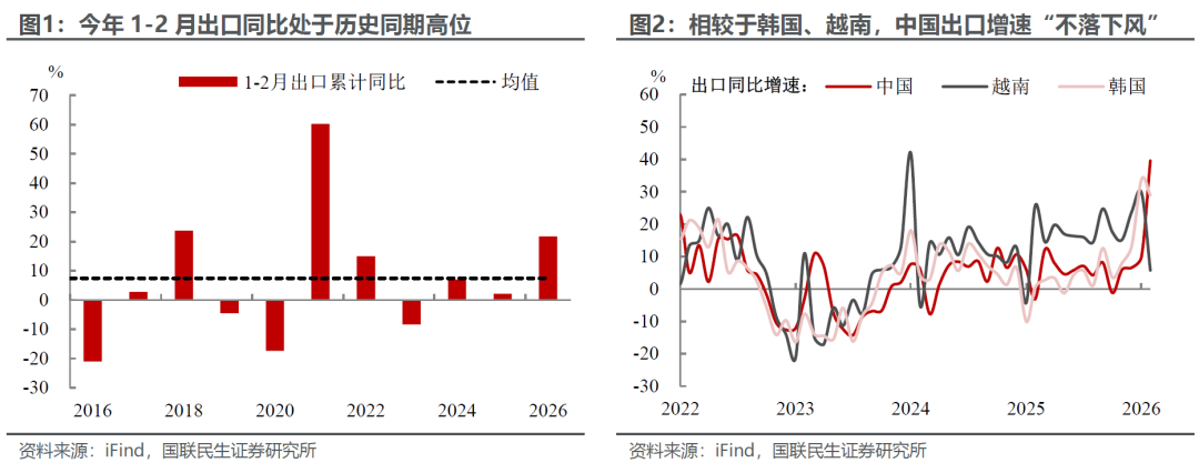 我们在去年的年终报告《2026年中国宏观展望:十问十答》中提示,今年“出口进”是贯穿宏观经济的核心线索之一,1-2月出口的亮眼表现已对此形成初步印证。但在闪耀的开年数据映射下,今年出口究竟能“进”到什么程度?